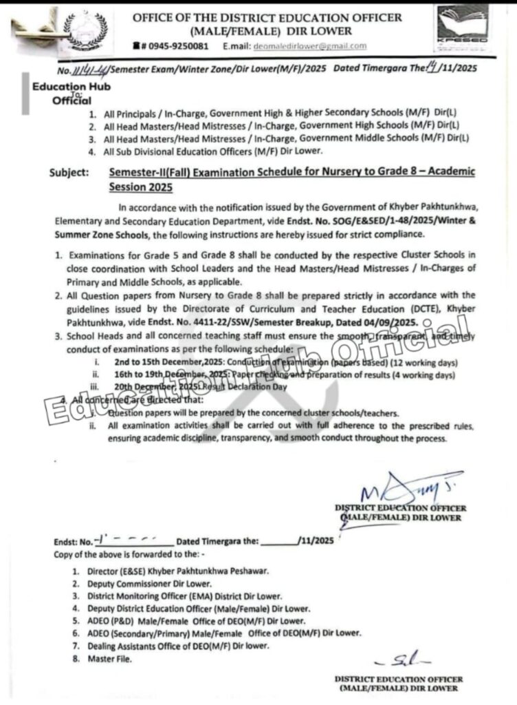 The District Education Officer (Male/Female) of Dir Lower has released a comprehensive notification outlining the Semester-II (Fall) examination framework for Nursery through Grade 8 in the Academic Session 2025. Aligned with the Khyber Pakhtunkhwa (KP) Elementary and Secondary Education Department’s directives (Endst. No. SOG/E&SED-1-48/2025/Winter & Summer Zone Schools), this schedule emphasizes cluster-based testing, standardized question preparation, and strict timelines to promote fairness and efficiency. Aimed at government high, higher secondary, and middle schools, it ensures coordinated efforts among educators for transparent evaluations. This resource breaks down the essentials for school leaders and teachers in the region.