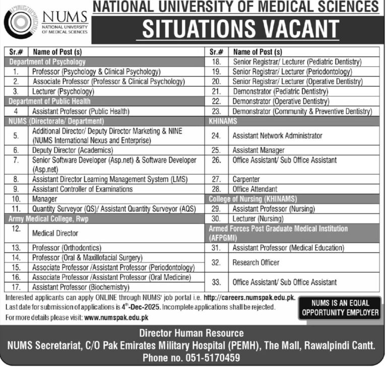 National University of Medical Sciences (NUMS) Rawalpindi has released its latest employment notification in November 2025, inviting applications for more than 33 prestigious positions across medical, dental, nursing, public health, IT, administration, and allied departments. This is one of the largest single-recruitment drives by NUMS in 2025 and offers excellent career opportunities in Pakistan’s leading military-run medical university.