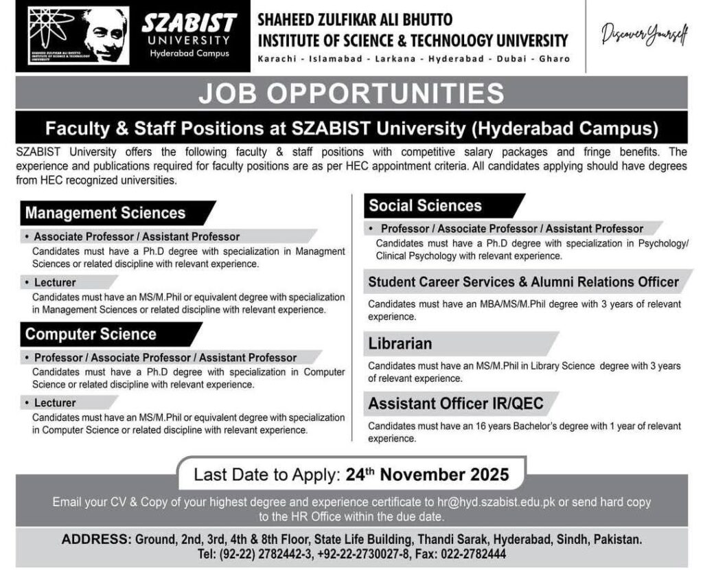 Shaheed Zulfikar Ali Bhutto Institute of Science and Technology (SZABIST) is expanding its team at the Hyderabad Campus with openings in academic and administrative fields. This drive targets qualified professionals to support innovative education in management, computing, social sciences, and support services. Offering attractive compensation and perks, these roles adhere to Higher Education Commission (HEC) standards for faculty. Ideal for experts seeking dynamic university environments, applications are open to HEC-recognized degree holders. Explore the breakdown below for a strategic application approach.